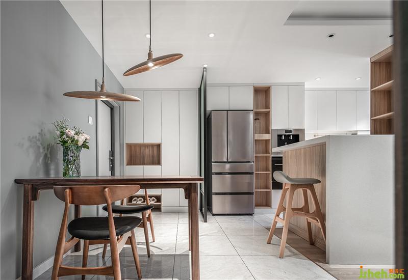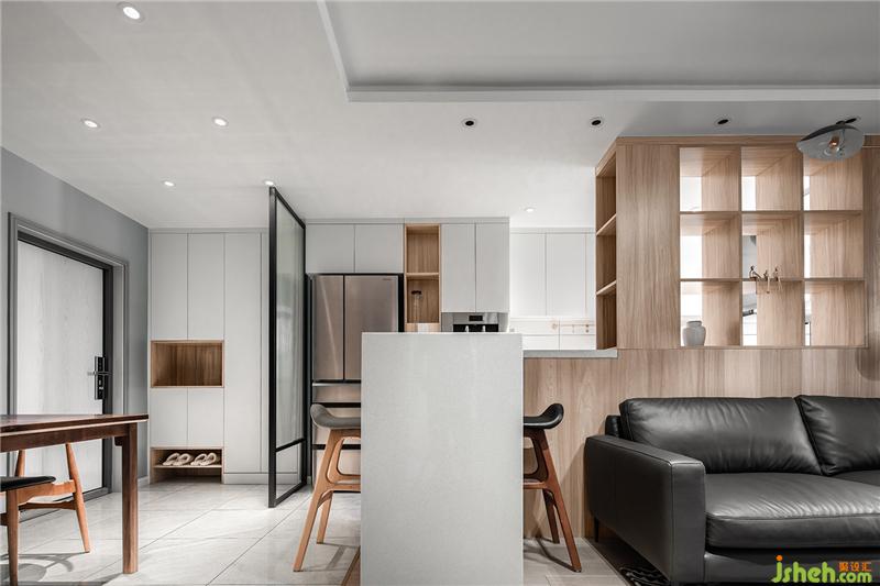 干凈的白色石材與柜板做了內(nèi)嵌,單純得簡單。作為廚房和客廳,客廳與餐廳之間的過度功能,吧臺顯然有著不錯的獨(dú)特作用。沙發(fā)和吧臺之間有一段800mm的距離,方便對坐吧椅擺放。