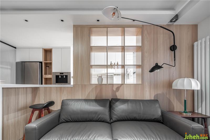 雙人的頭層皮沙發(fā)選自Norhor,依靠吧臺的擺放,讓坐在上面的人更有一種被圍合的依賴感。透過開放格,可以直接窺視到對面廚房的煙火氣。圍繞沙發(fā)的櫥柜+吧臺+書柜組合,用了3張飾面板做鋪貼,選自科定板K6176AS。因?yàn)檎逡讖?,在現(xiàn)場與無基層的家具固定,顯然是一件非常棘手的問題。所以在櫥柜還沒進(jìn)場之前,就要把科定板帶到廠家車間做加工。