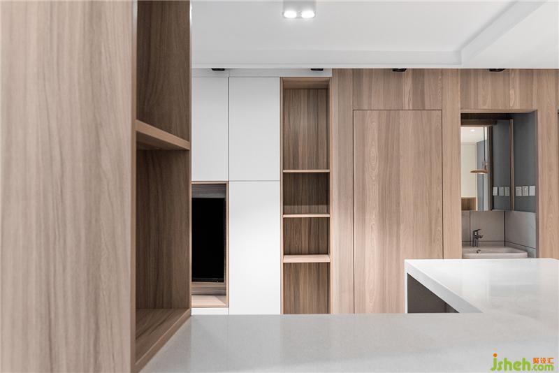 利用櫥柜,收納,動線綜合組成設(shè)計(jì)的吧臺,讓空間達(dá)到更有效的使用。轉(zhuǎn)角吧臺上有一段書柜,180°的三向開口,讓擺放的形式不單一。