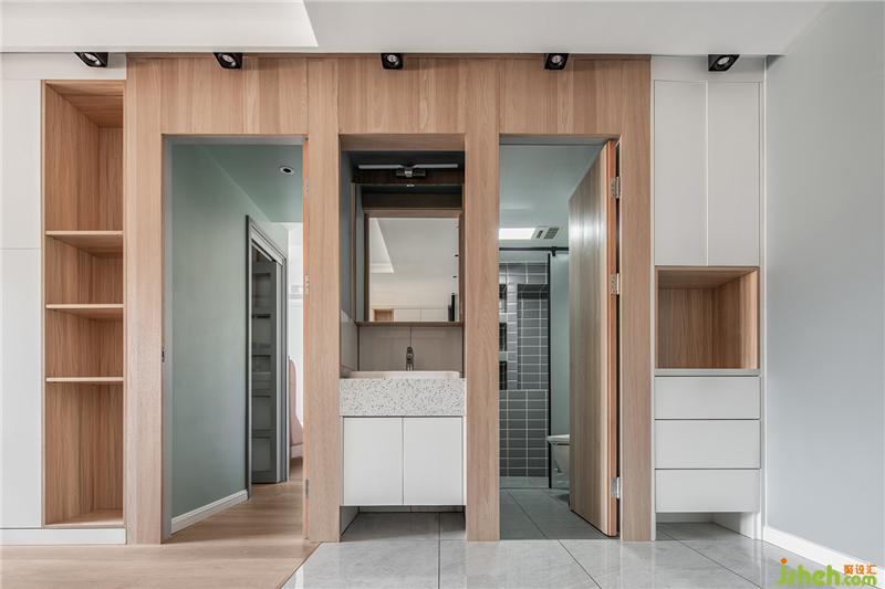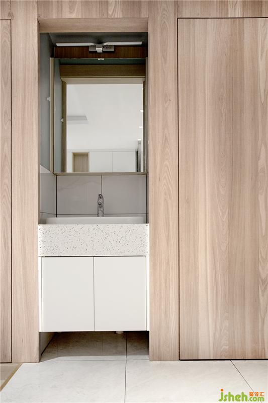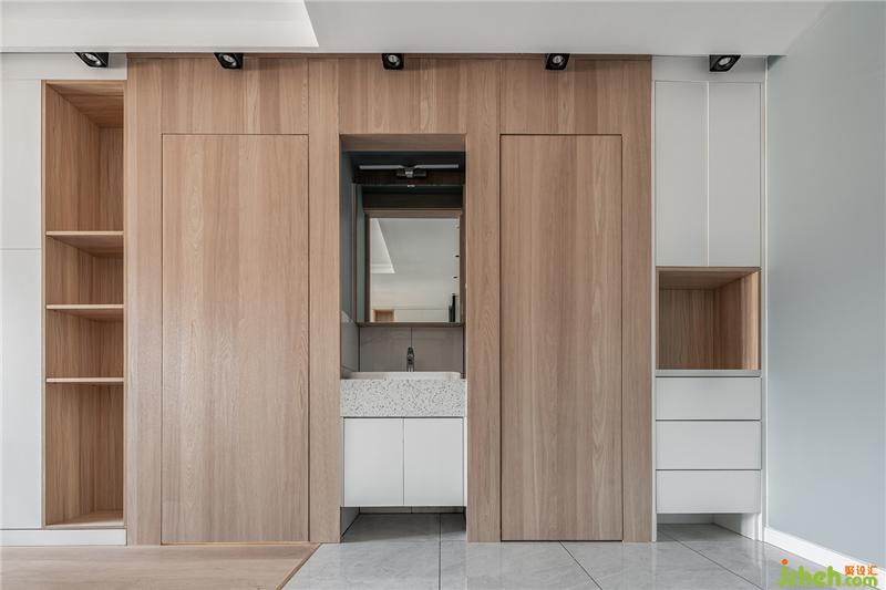 拆除的墻體,“掏”進(jìn)了一段800mm的洗手柜,干濕分區(qū)也讓里面的衛(wèi)生間減少了不少負(fù)擔(dān)。水磨石搭配白色柜板質(zhì)感很好,在整墻的木色當(dāng)中有一種留白的自然。鏡前燈選擇的是4000k色溫,這樣照鏡子的感覺才更真實(shí)。