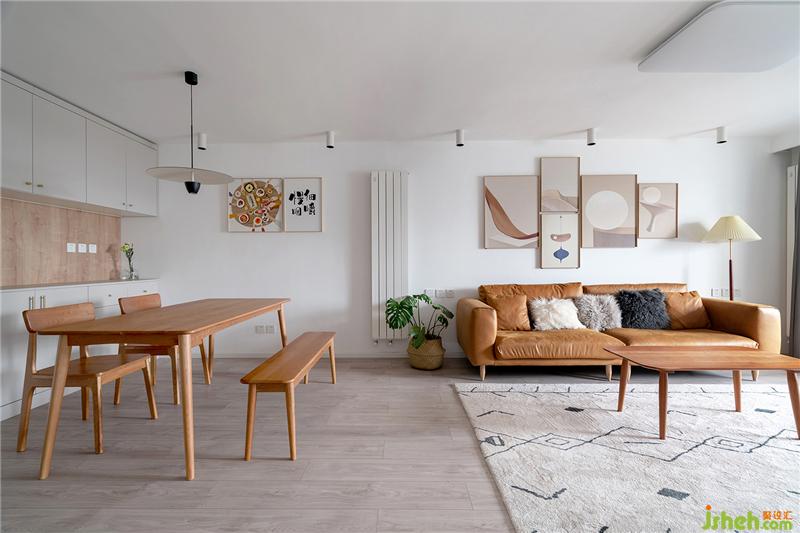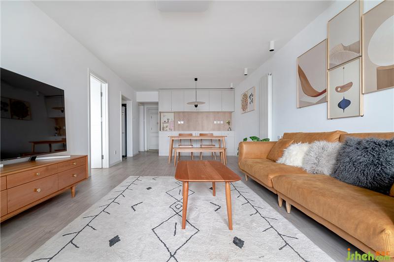 沙櫻桃木的家具與焦糖色的沙發(fā)相得益彰,配色讓整體的空間更加融洽,沙發(fā)背景沒有做復(fù)雜的處理,屋主自選了幾副裝飾畫點(diǎn)綴。淺灰色的復(fù)合地板,搭配白麻地毯,提升了不少舒適性。