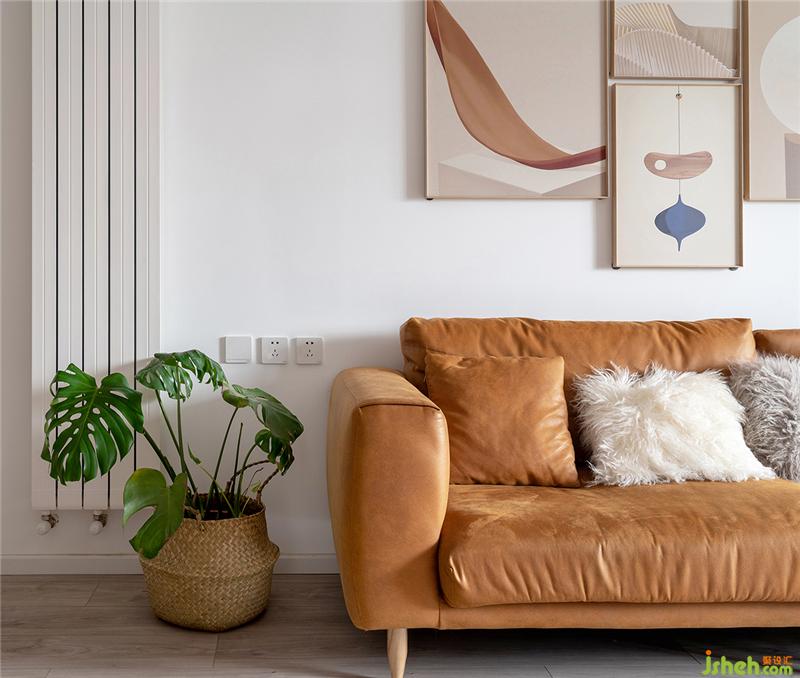 白色的墻面作為底色,點(diǎn)綴綠色的龜背,棕色的沙發(fā)以及素色的掛畫,完善整體層次關(guān)系與空間感。