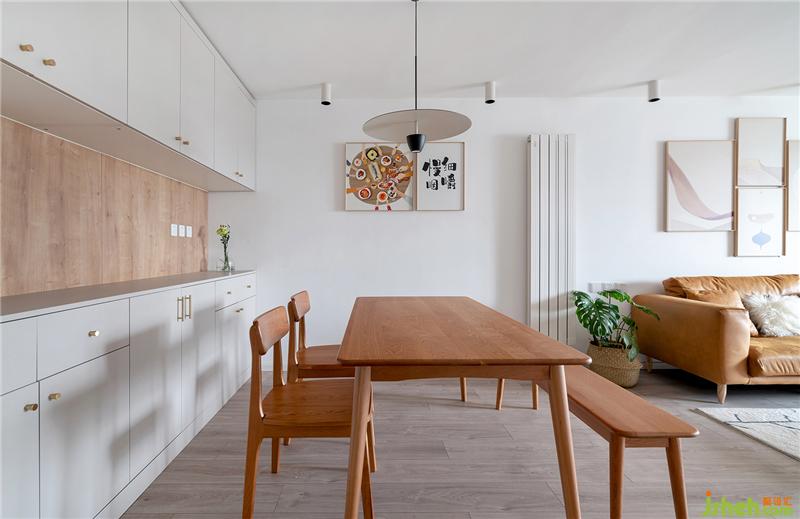餐廳一側(cè)做了整組柜體,釋放一部分廚房操作臺(tái)功能,還增加一部分整屋的收納空間。中間臺(tái)面區(qū)域,可以擺放一些小家電以及一些裝飾品。