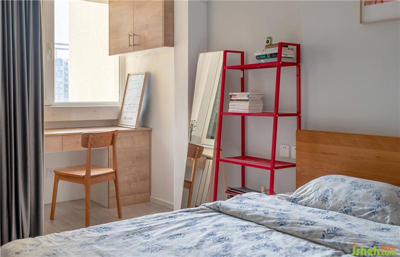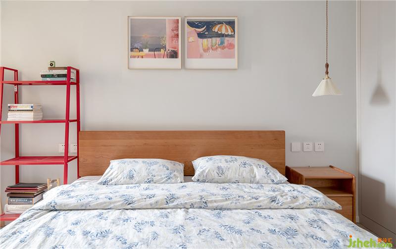 在床頭擺放了一組紅色的書柜,地臺(tái)床頭柜,還讓收納翻倍。