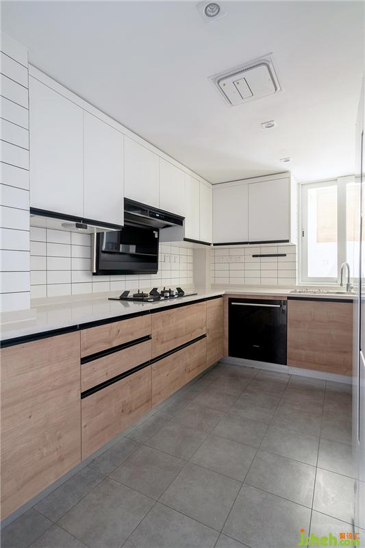 廚房墻面小白磚讓整個(gè)空間更加的白凈,地面深灰色瓷磚,平衡了沉穩(wěn)的效果。白色的吊柜與原木底柜搭配,簡(jiǎn)單自然。