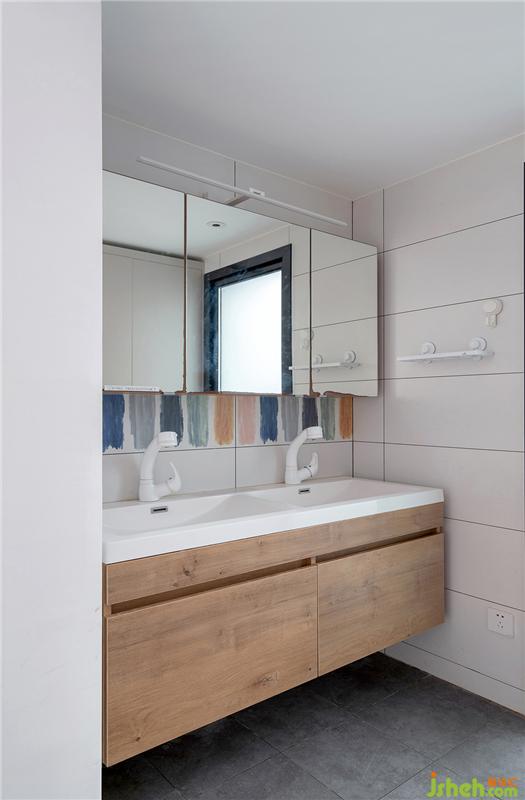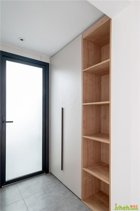 衛(wèi)生間入口區(qū)域做了一組儲(chǔ)物柜,擺放全屋的清潔用具。柜體沒(méi)有全封閉,局部做了開放格,可以隨意更換衣物,擺放浴巾等生活用品。