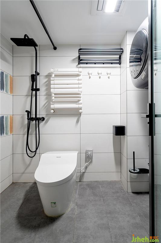 衛(wèi)生間過(guò)道全景,黑色鈦鎂合金磨砂玻璃門,與白色瓷磚形成了黑白配。衛(wèi)生間整體以簡(jiǎn)潔為主,搭配兩三片花色磚提升清新質(zhì)感。