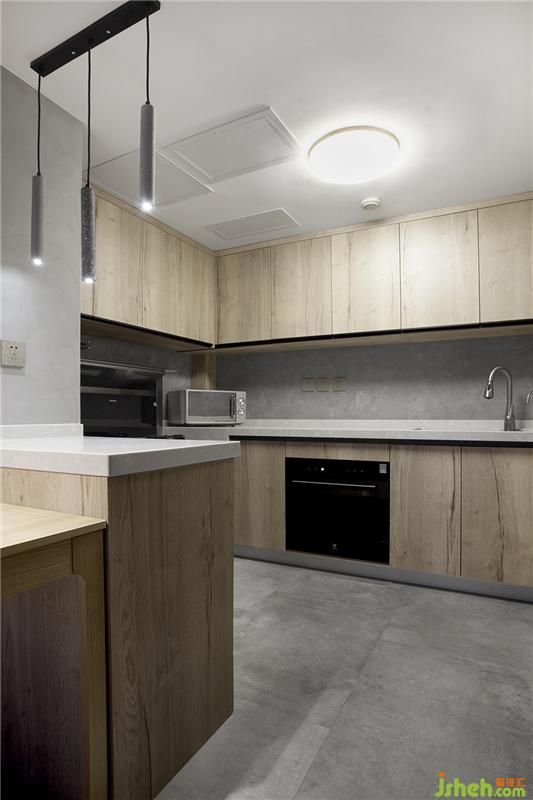 開放式的廚房,原來在水盆的左上方是有窗戶的,但是基本沒有采光,所以干脆就堵上了,這樣吊柜也可以多一些,通風不用擔心,家里安裝了全屋的新風系統(tǒng)。