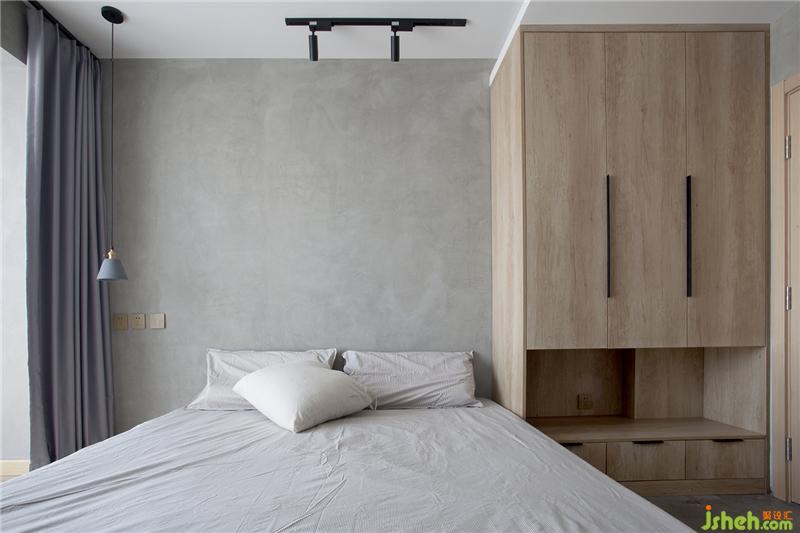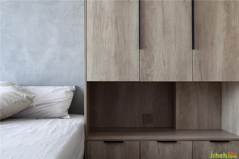 衣柜的設計同樣也是別有用心,挨著床的高度設計成落空的,首先這樣可以解決在床上隨手放置的物品,其實最重要的也是視覺上的,床頭這里不會因為這個通高的衣柜顯得壓抑。開放格里放置了感應的燈帶,起夜的時候也是一個夜燈的裝置。