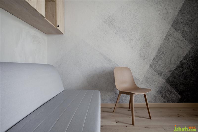 墻面用了幾何壁紙,更加符合這個空間的氛圍,沙發(fā)床可以隨時展開使用。