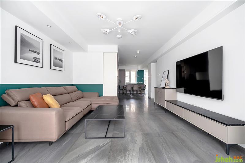 墨綠的半墻分隔,存在的意義不僅是作為空間的一個色彩點綴,同時它會在立面視覺上,把客廳背景橫向加長。因為它的存在就會把一整快墻,無形中分成兩個個長方形。原本簡單的背景,就會增添很大的空間感。