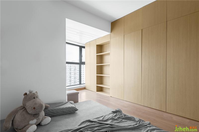 兒童房的一側(cè)做了整面墻的收納柜,孩子隨著年齡的增長玩具、書籍、衣物會越來越多,無處擺放就會使空間變得雜亂,大量的儲物柜會解決這些令人頭疼的問題。