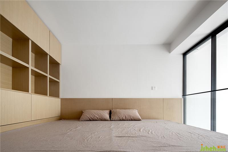 主臥中包含一間凈深2550mm儲物間,儲物形式?jīng)]有選用尋常的柜體,而是選擇簡單的白色鐵藝框架,雜物擺放形式多樣化,足以收納夫婦二人平時的生活物品。主臥儲物柜上方將空調(diào)藏入柜體中,使用時將液壓桿撐起,不使用時看似一個整體,最化程度弱化空調(diào)的存在。