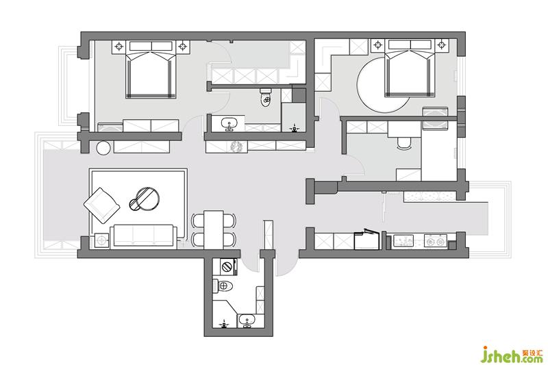 原始戶(hù)型墻體基本上以承重墻體為主。戶(hù)型缺點(diǎn)原有餐區(qū)位子在進(jìn)入廚房的主要通道上影響通道的使用??团P書(shū)房外的通道與廚房之間的洞口雖然形成了環(huán)形路線但形成了空間的浪費(fèi)。
