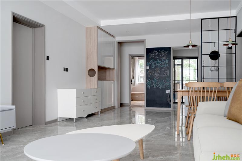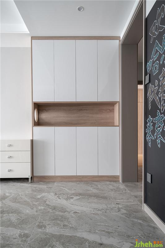 玄關(guān)對(duì)面做了換季的鞋柜以及貓咪的活動(dòng)區(qū)域,在臥室通道以及廚房入口之間的墻體貼了黑板墻貼。