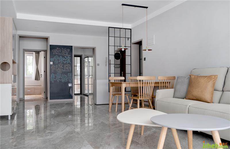 從客廳看向餐廳,進(jìn)門(mén)左手邊是換鞋凳和收納柜,主要方便收取快遞等物件臨時(shí)存放,在收納柜上方是十字格配上掛鉤回家后的包包以及鑰匙可以掛上在這里。