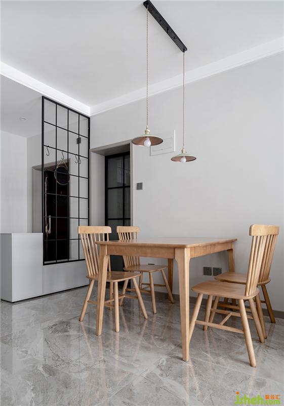 餐桌往左走分別是次衛(wèi)衛(wèi)生間門(mén)玄關(guān)區(qū)域換鞋凳。黑色金屬十字格,灰色換鞋凳,木色餐桌,以及帶有復(fù)古元素的燈具構(gòu)成了餐廳的一角。
