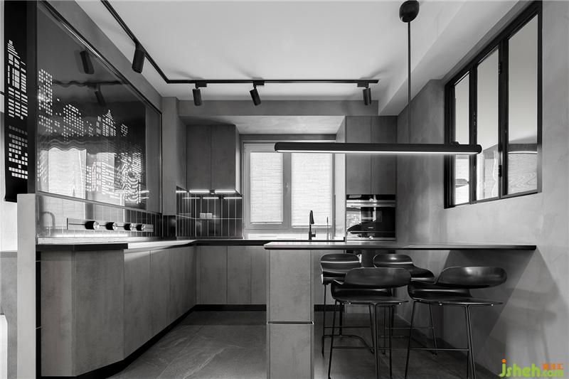 西廚區(qū)選擇軌道射燈與吊柜下方的感應(yīng)燈輔助照明,使空間內(nèi)沒有暗角,餐桌吊燈平視時看不到底下的光源,避免對視覺上的刺激。操作臺一側(cè)的墻面安裝科技感十足的軌道插座,讓制作美味的過程充滿靈活性。