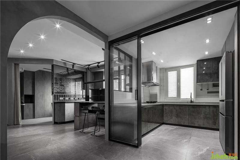 將原戶型中廚朝向客廳的墻體拆除,向外延伸空間面積并用玻璃推拉門做隔斷,不僅擴大了中廚操作臺面積而且使內(nèi)部采光更通透。