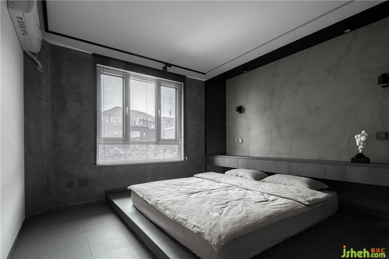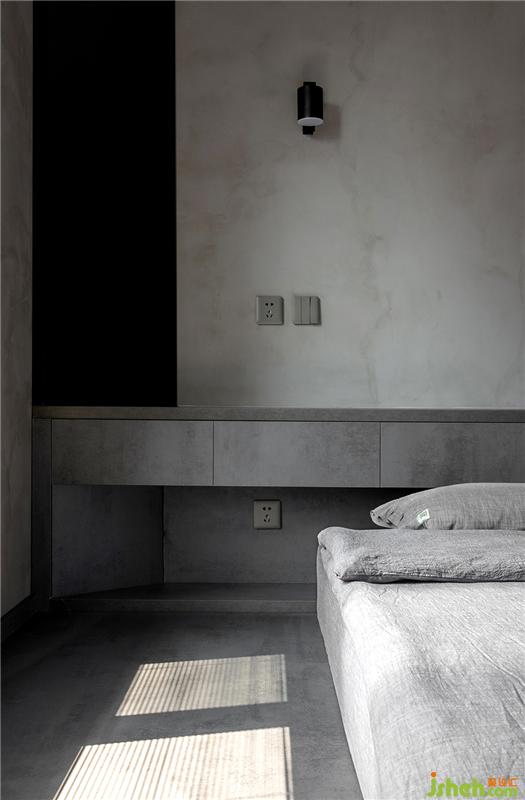 整體空間沒有太多雜色,中灰色調(diào)占領(lǐng)主導(dǎo)地位,衣柜柜板選擇灰色的木紋材質(zhì),仿水泥的自然肌理非常有質(zhì)感。由于柜板高于2m,內(nèi)部需要安裝拉直器防止變形。為了保證整體的統(tǒng)一,臥室地面與空間色調(diào)一致,仿布紋的地磚在柔和視覺的同時(shí)能夠緩解四周硬質(zhì)的感覺。