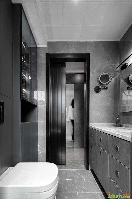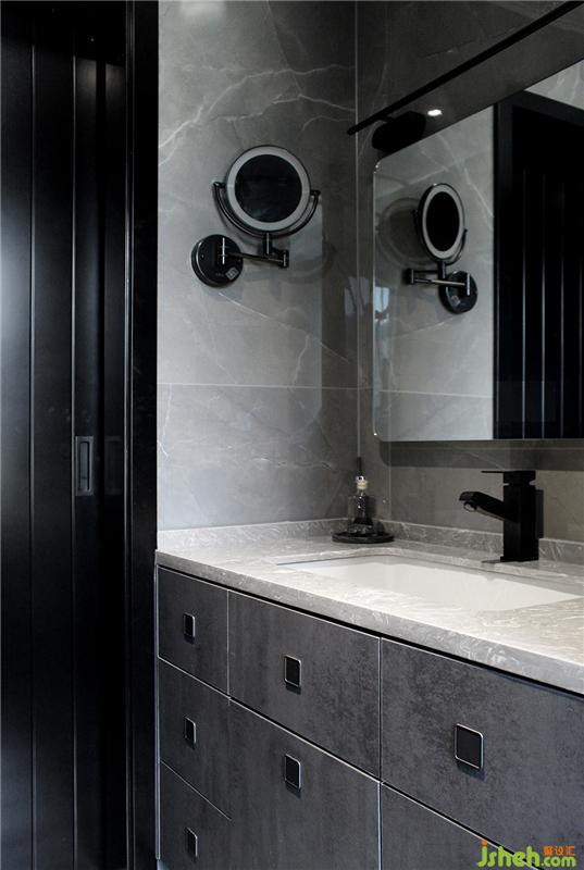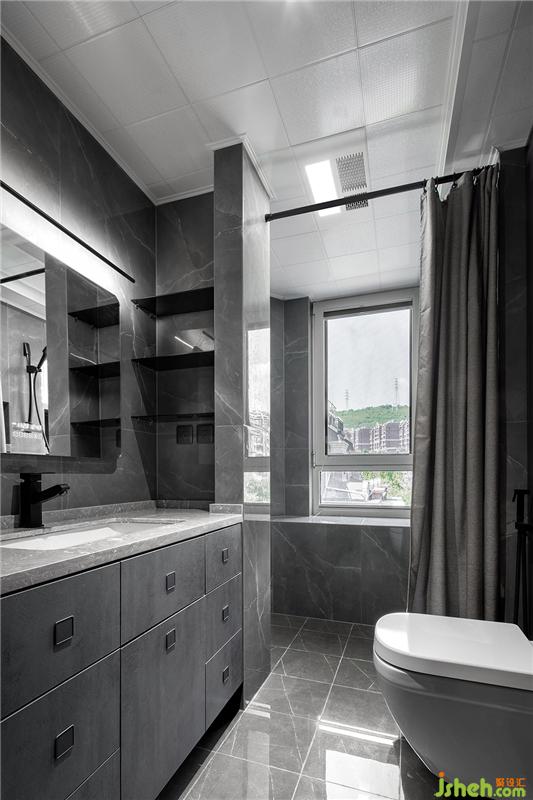 衛(wèi)生間墻地磚一體,均為灰色系,浴簾的使用能夠很好的劃分干濕區(qū)。利用墻體在洗手臺(tái)一側(cè)制作開放格,黑色玻璃作為隔板,節(jié)省了洗手臺(tái)不少的空間。