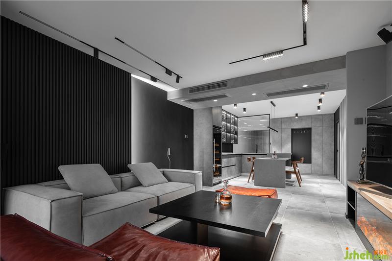 到頂?shù)暮谏珜嵞驹煨桶逵米錾嘲l(fā)的背景墻,板面經(jīng)過開槽加工處理,側(cè)邊安裝線性燈帶,具有科技感。