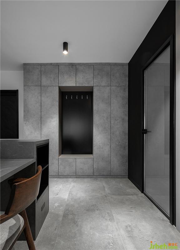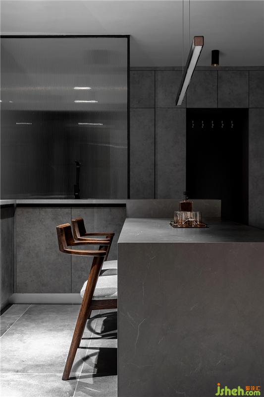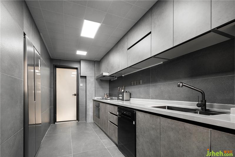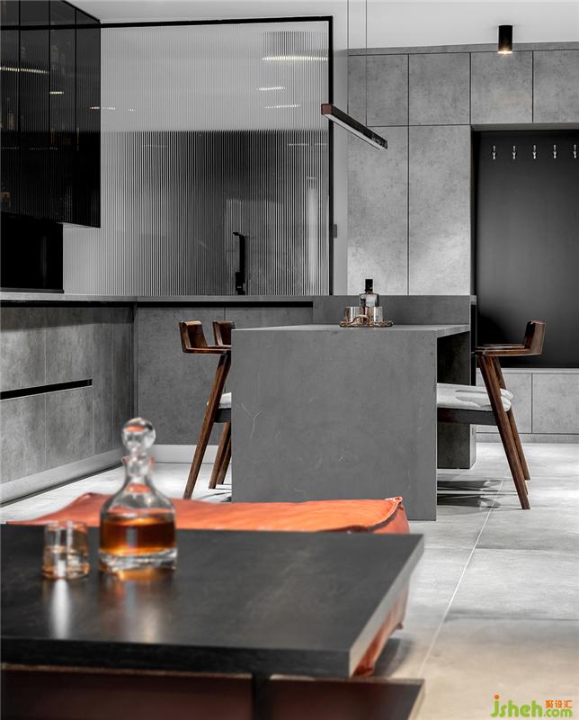 中廚區(qū)大量的底柜與吊柜具有很強的收納能力,水泥灰色的柜門與整體風格統(tǒng)一。黑白灰是亙古不變的經(jīng)典顏色,靈活運用連廚房也可以變得很高級。