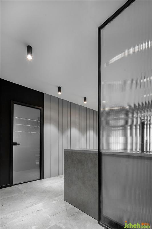 書房與主臥同樣選用無主燈設(shè)計,筒燈照射出色溫3000k的柔和的光線更適于工作與休息。黑色踢腳線與淺灰色墻面形成鮮明對比。