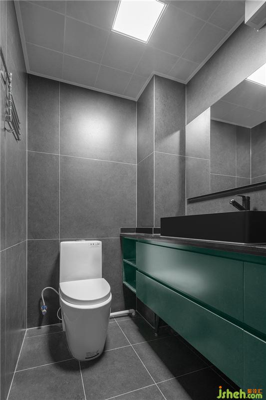 客衛(wèi)臨近馬桶位置安裝了與眾不同的方形淋浴房,規(guī)格為800*800mm。門的開啟形式選擇雙側推拉,既方便又節(jié)省空間。淋浴房方正中的線條美感搭配灰色墻地磚帶來現(xiàn)代風格的舒適感。