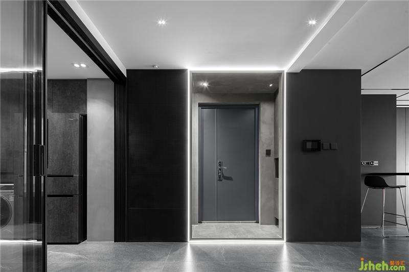 將玄關(guān)區(qū)域地面抬高10公分,室內(nèi)形成下沉空間??梢愿玫拇_定功能分區(qū),而且增加了空間的趣味性,更使其富有層次感。將四周的墻面嵌入線性燈帶形成“口”字形造型,利用燈光將玄關(guān)區(qū)域獨立出來,營造出不一樣的氛圍,進屋后的第一儀式感。