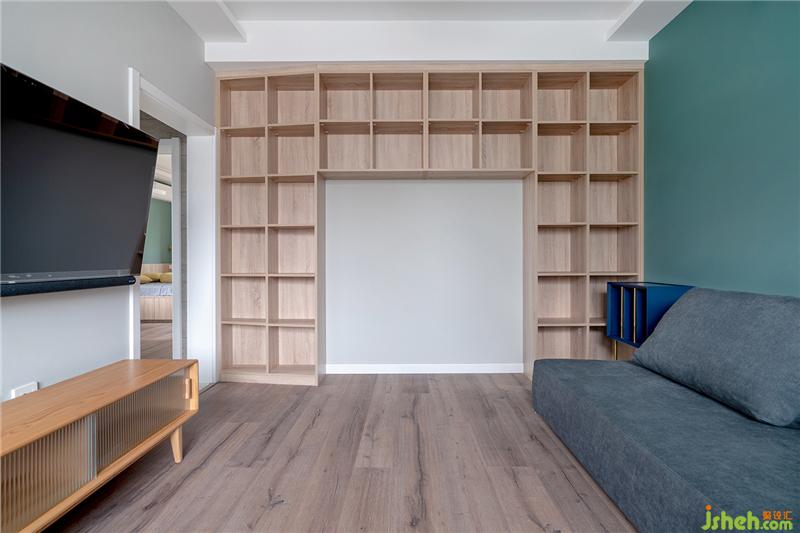 客廳區(qū)域利用埡口與墻之間的距離做了整面墻的定制柜開放格,可容納孩子大量的書籍,也可展示一些收藏,具有很強實用性。地面鋪貼了略帶結疤的實木地板,地板呈現(xiàn)出原始的紋理與顏色,體現(xiàn)出自然之美。
