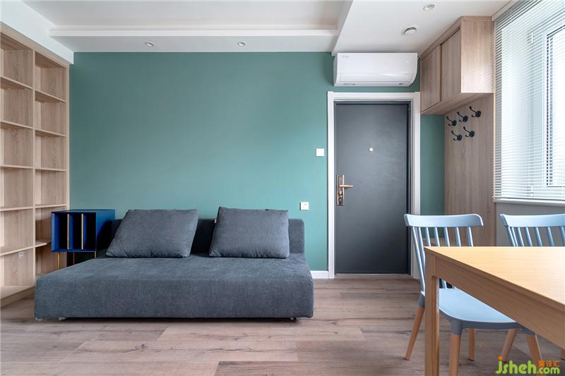 沙發(fā)背景墻涂刷了莫蘭迪色系墻漆,搭配深灰色沙發(fā)床給空間帶來寧靜祥和的氛圍。擺放在角落的深藍色邊幾小巧而獨立,具有收納能力的同時充斥一絲高級感。