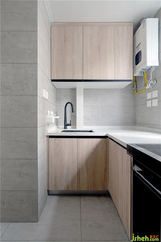 廚房采用高級灰的墻磚與原木色柜體相結(jié)合,搭配白色石英石臺面,使得風(fēng)格更自然純樸。集成灶是小廚房的福音,它能夠省出不少的吊柜空間,非常劃算。