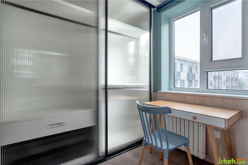 書桌一側(cè)的衣柜選用鈦鎂合金窄邊框長虹玻璃推拉門,顏值超高通透感十足。安裝在書桌下方的散熱片要提前考慮好尺寸,避免產(chǎn)生不必要的尷尬。