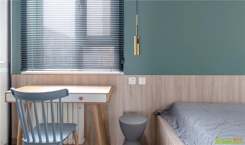 黑白灰加以木色,滿滿的北歐風(fēng)令人感到寧靜祥和,床頭墻上方淺墨綠色的墻面為空間增加一抹亮色,作為空間的點(diǎn)綴。