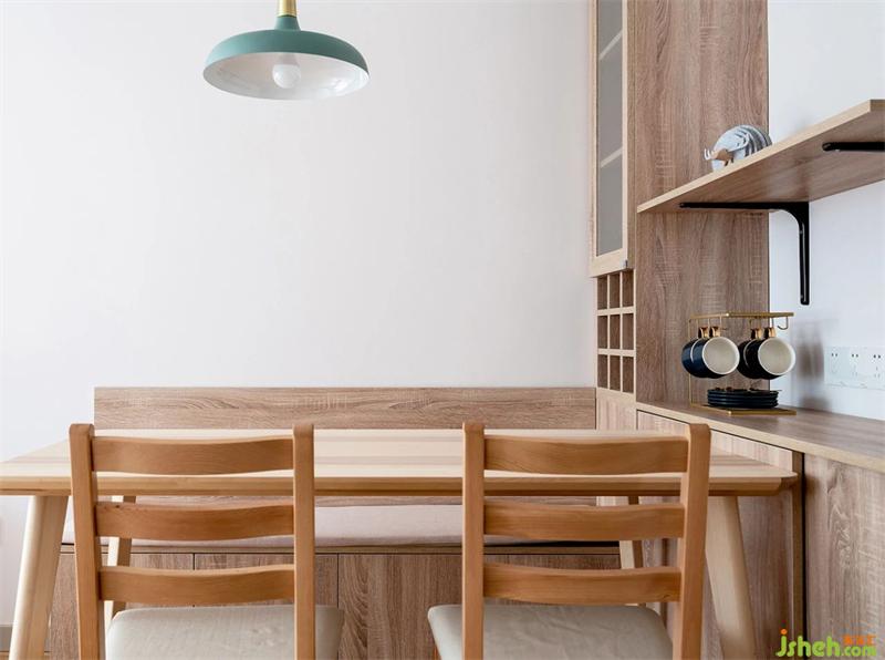 卡座一直是小戶型的不二之選,空間利用絕對高,還能增加儲物和收納。餐桌邊上設(shè)計了餐邊柜,平時的一些小電器方便使用,紅酒還有收藏的一些杯子也有空間展示。