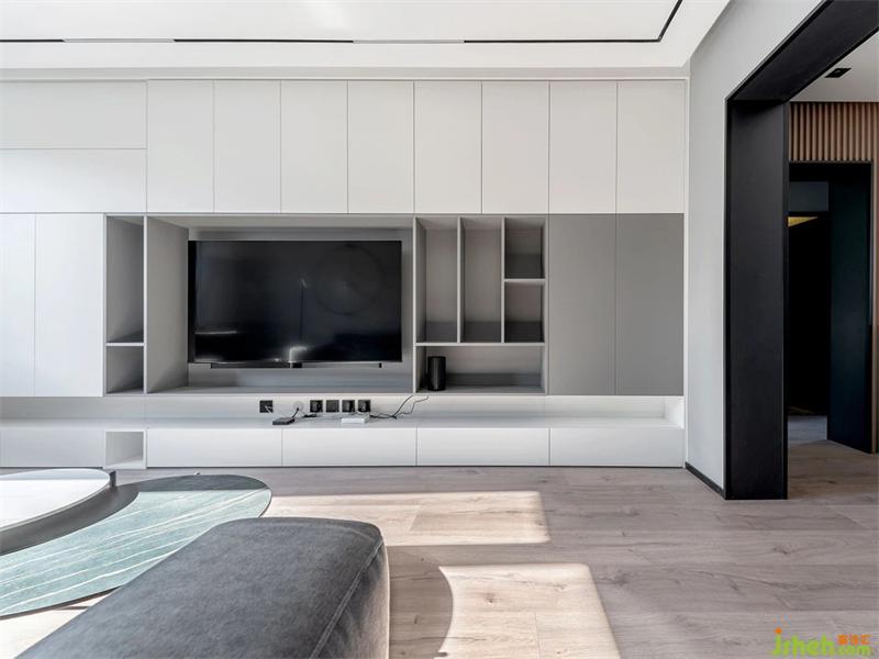 3.客廳采用了儲(chǔ)物式電視背景墻作為裝飾,充分滿足了住戶的收納需求。