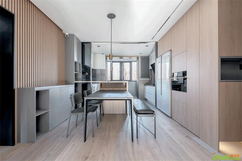 餐廳左右雙動(dòng)線,左側(cè)吧臺(tái)可以作為一個(gè)臨時(shí)的辦公區(qū),右側(cè)動(dòng)線延伸貫穿,廚、客、餐整個(gè)區(qū)域。餐廳兩邊都設(shè)有收納柜,讓整體的儲(chǔ)物功能得到的大大的加強(qiáng)。半開放式的廚房用推拉門進(jìn)行隔斷。保證空間寬敞、明亮的同時(shí),還能提升互動(dòng)感。