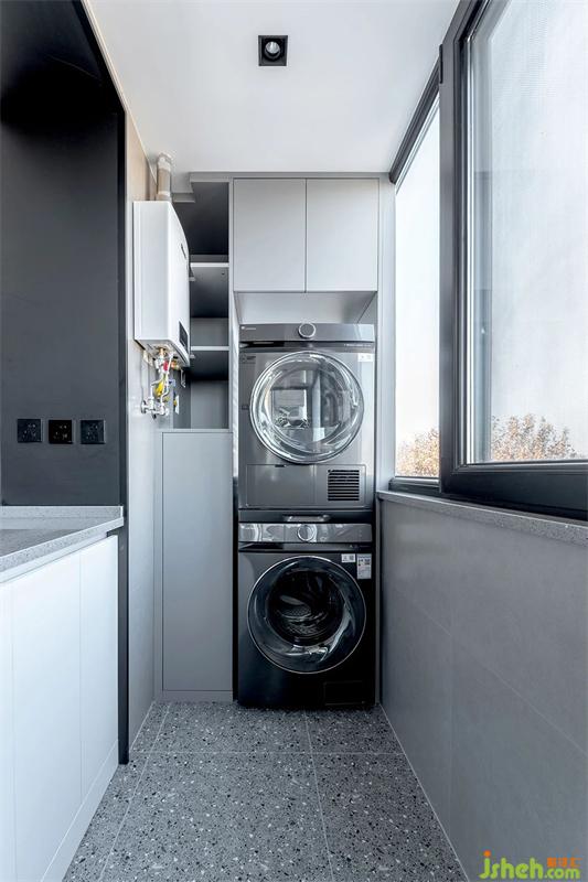將洗衣機(jī)與烘干機(jī)挪到了廚房陽臺(tái),并用儲(chǔ)物柜進(jìn)行包裹形成一個(gè)整體。洗滌用品和晾衣工具都可以放在柜子里,讓物品可以集中存放。