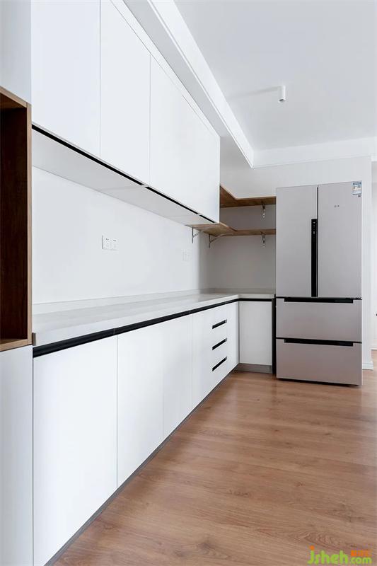 原有戶型為一字型櫥柜,天津裝修設(shè)計(jì)為了增加儲(chǔ)物和操作臺(tái)面,通過(guò)更改門洞位置,增加了一排櫥柜,更改為L(zhǎng)型布局。為了阻隔油煙問(wèn)題,增加一組長(zhǎng)虹玻璃推拉門作為隔斷。