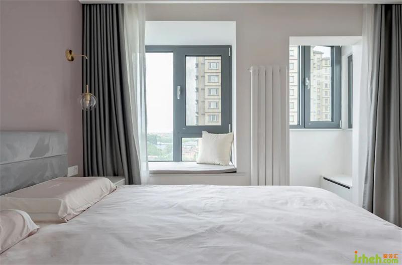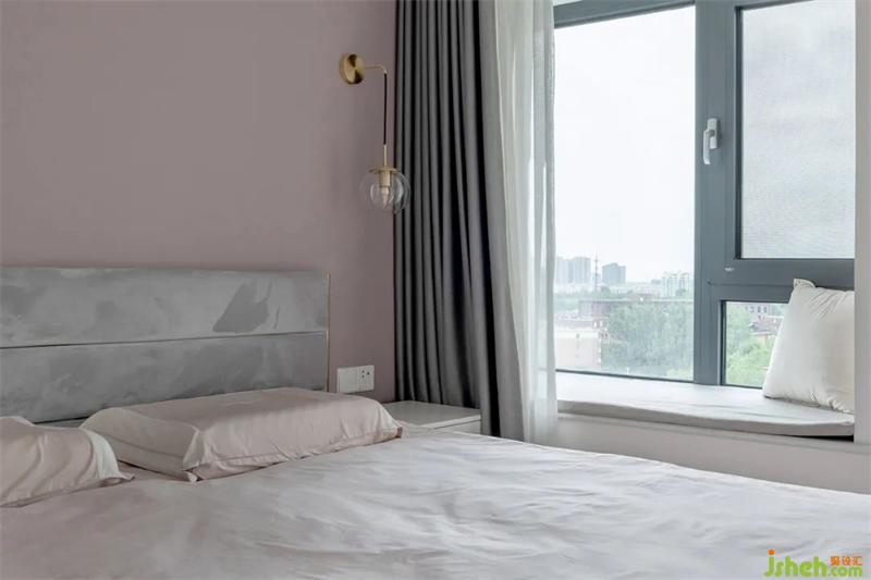 陽光穿過飄窗,撒落在床頭,粉色帶來溫柔,金色優(yōu)雅精致。