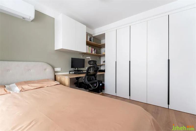 床頭預(yù)留了小壁燈功能,為了方便起夜,原有壁燈上面是空調(diào),我們結(jié)合現(xiàn)場情況,改到了對面,這樣床的背景墻就比較整體和干凈了。放置了整排落地衣柜,滿足居家生活的儲存。頂面局部作了吊頂,柜子也能直接到頂。這樣整體感會更好,床的擺放也很居中,讓周邊的活動空間寬敞不少。