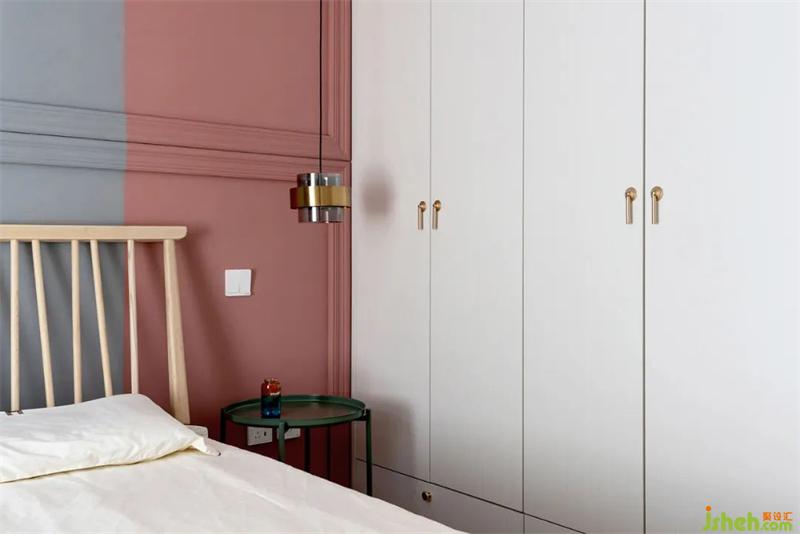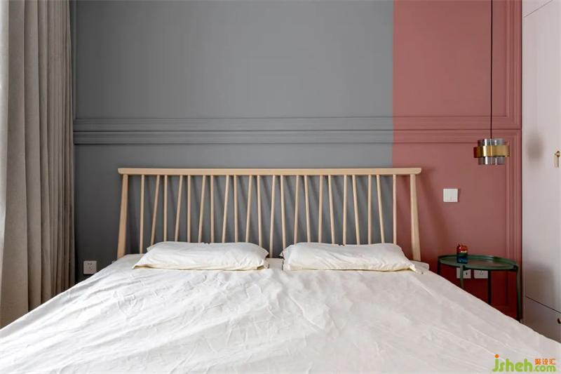 臥室采用了三種墻漆進(jìn)行裝飾,頂部是白色+臟粉色,床頭背景墻則是灰色+臟粉色塊。用不同的顏色“撞”出不一樣的空間藝術(shù)感。