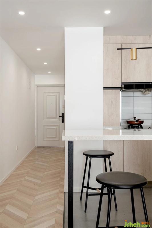2.廚房區(qū)域打開后,最大化釋放空間,也滿足一定的收納需求。從櫥柜延伸一段吧臺(tái),可以滿足基本就餐。