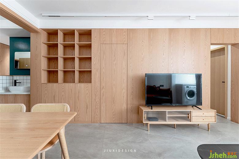 整合客廳的一面墻,分別置裝修入書柜和隱形門。紅橡木統(tǒng)一材質(zhì),兩個門洞形成的洄游動線將客廳,衣帽間,臥室,陽臺多個串聯(lián)起來,加強(qiáng)空間之間聯(lián)系的同時,增添空間的趣味性。