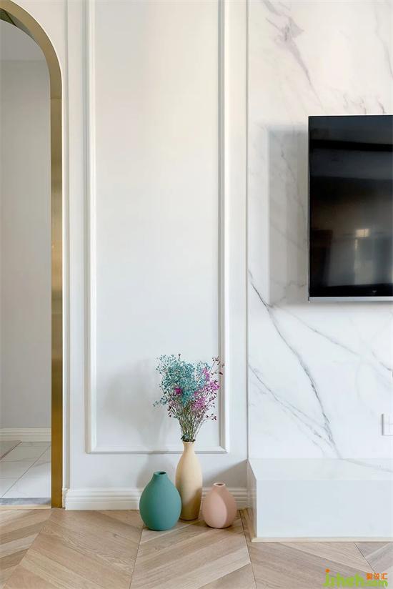 金色的門套搭配石膏線,配上爵士白石材,簡單的輕奢風(fēng)也不會顯得太過復(fù)雜。重點要說的是這個拱形門洞,完成這樣的窄門套,對木工工藝要求度要高,需要達(dá)到完成面都是齊平的標(biāo)準(zhǔn)。