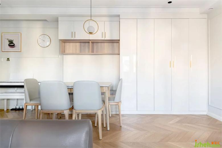 白色柜體遇上木色家居會溫馨很多,搭配原木魚骨拼的地板,簡單中含有一些變化。