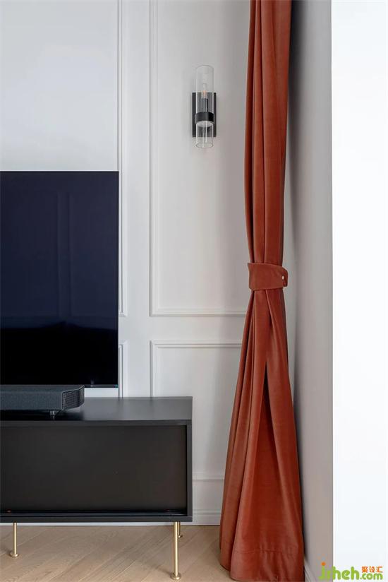 純黑色的電視柜搭配深灰色沙發(fā),使客廳更加沉穩(wěn),橘色的窗簾使整體不顯沉悶。