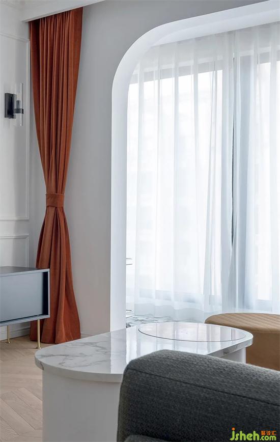 經(jīng)紗簾過(guò)濾過(guò)的光線更加柔和,大理石茶幾的臺(tái)面讓空間的材質(zhì)更有層次。