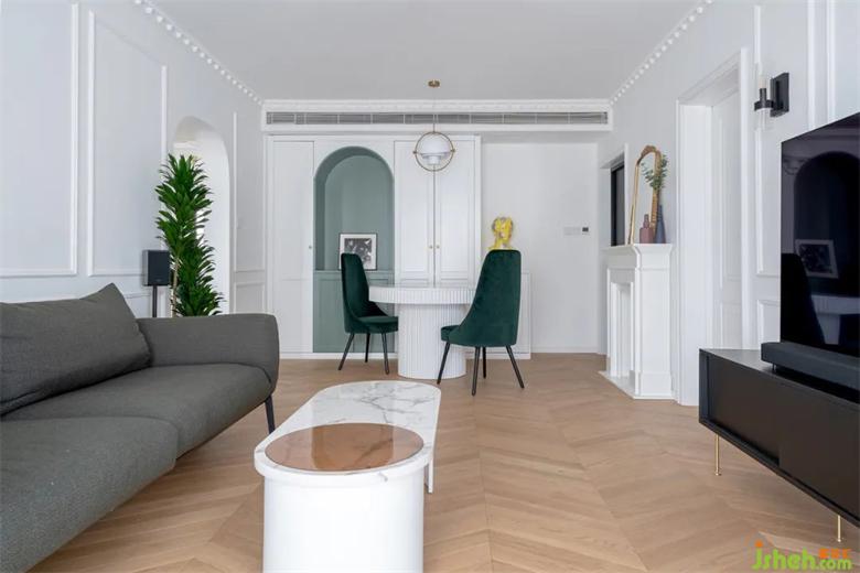 在白色的儲物柜中,內(nèi)嵌入了牛油果綠的餐邊格,裝修打破常規(guī)增強(qiáng)視覺感受,圓形的餐桌讓動線更流暢。